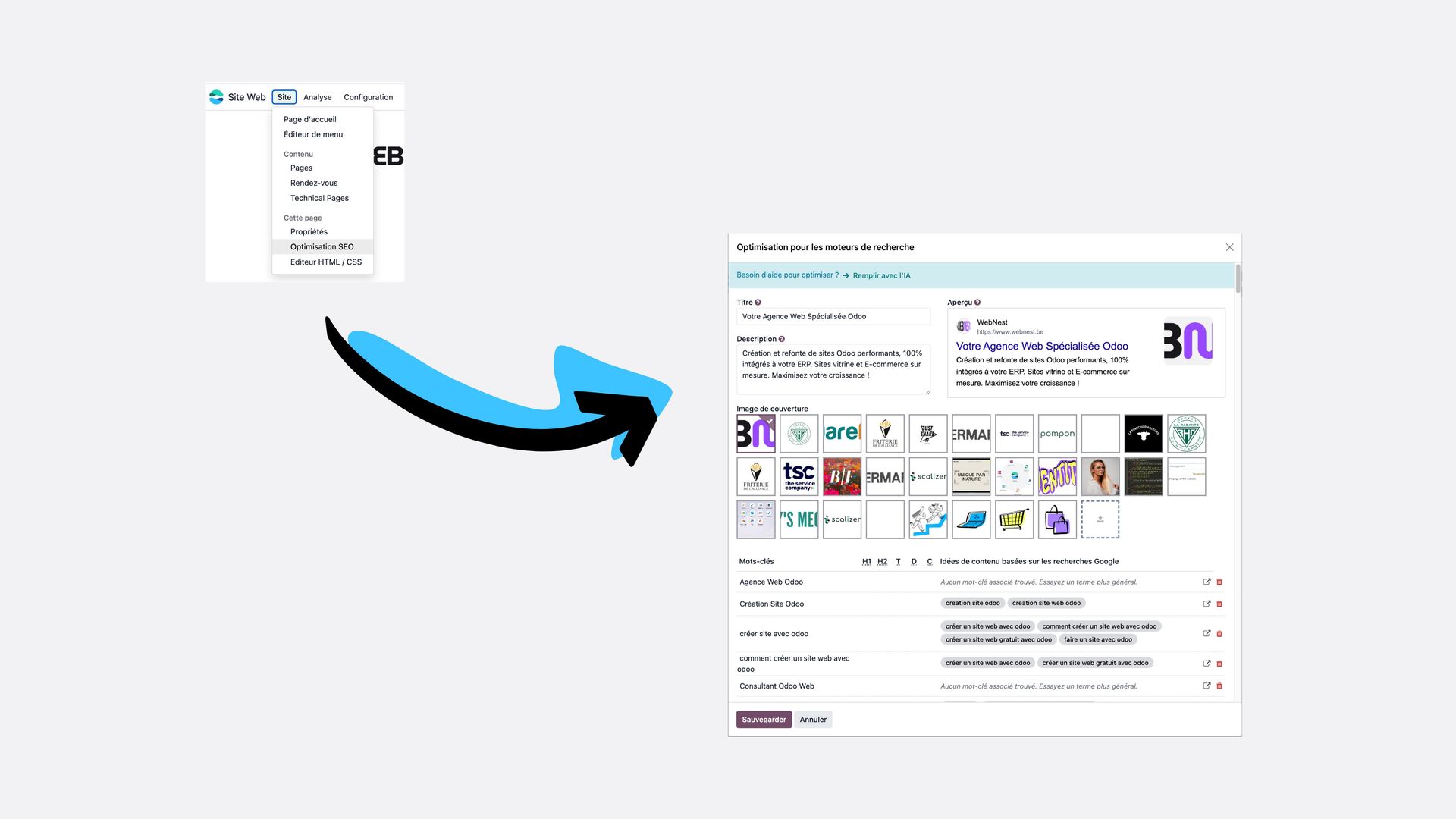 Dans Odoo, allez dans "Promouvoir" > "Optimiser le SEO". C'est ici que vous sifflez à l'oreille de Google pour lui dire précisément ce que vous faites.